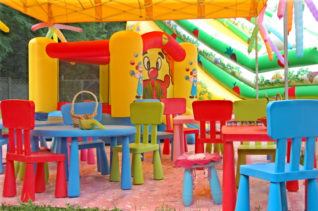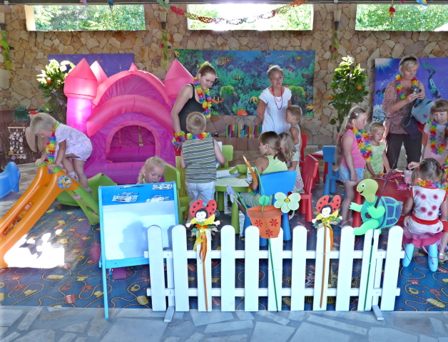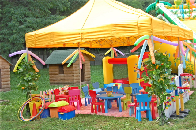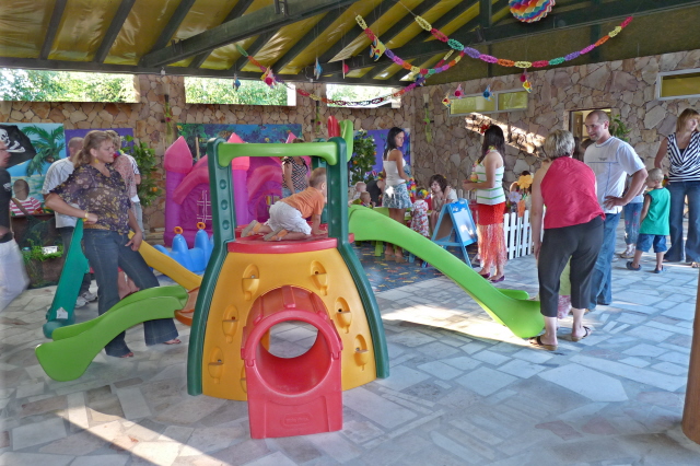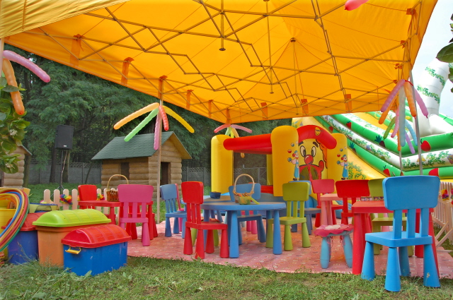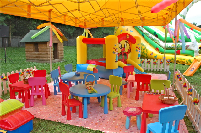 Oferta placu zabaw dla dzieci zawiera stoliczki, krzesełka, zjeżdżalnie, bujaki, tablice edukacyjną i wiele innych rekwizytów potrzebnych do zabawy. Cały plac zabaw znajduje się pod namiotem, który chroni najmłodszych przed deszczem lub nadmiernym słońcem.